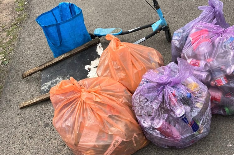 The total collection amounted to four purple bags of recyclables, two of general waste and one glass.