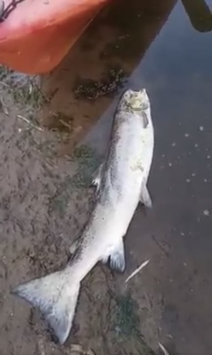 “Another dead salmon… counted several this evening. Pollution and low river level are coming together and the salmon don’t stand a chance.”