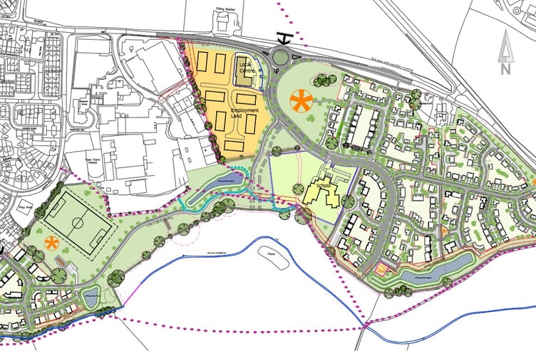The outline planning application is for up to 375 homes, a first form entry primary school including nursery, up to 83,958.5 sq ft of employment land and a centre which could have shops, cafes and a hot food takeaway.