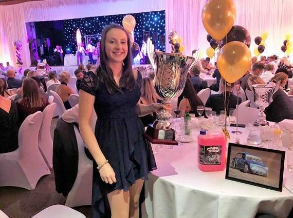 SPEED queen Kathryn Harding from Mitcheldean has proudly lifted the trophy for the British Autograss Series 2018 ladies class four championship.